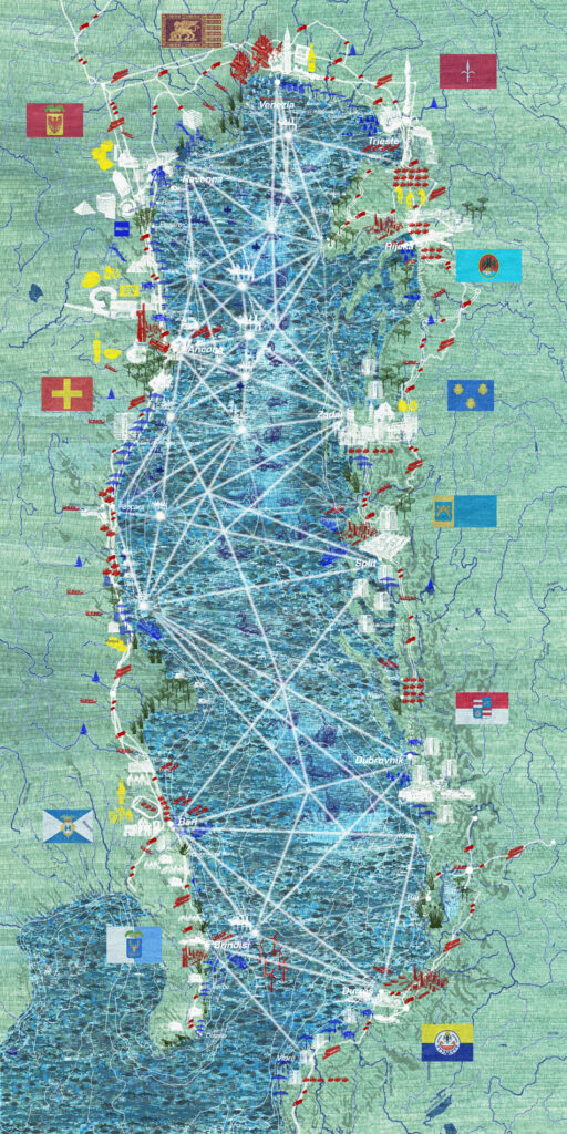 Per cambiare bisogna osservare con occhi diversi, allenare lo sguardo a una percezione nuova, sfuggendo a visioni e azioni sclerotizzate dalle abitudini. Adriatic, a Map for a New (Dis)order è una nuova visione dello stesso mondo, il cui centro è il mare, soggetto plasmante di un futuro ordine possibile. Rivedere l’Adriatico significa ragionare su un modello strategico estensibile, perché microcosmo che concentra dinamiche globali. In questa sottilissima striscia di “terracqua” si incontrano tre importanti tradizioni culturali e religiose: islamica, ortodossa e cattolica. Per la sua posizione strategica è stata fin dai tempi di Marco Polo porta e “porto” commerciale tra Oriente e Occidente, e i suoi litorali, per lo stesso motivo, proiezione di sogni imperialisti.