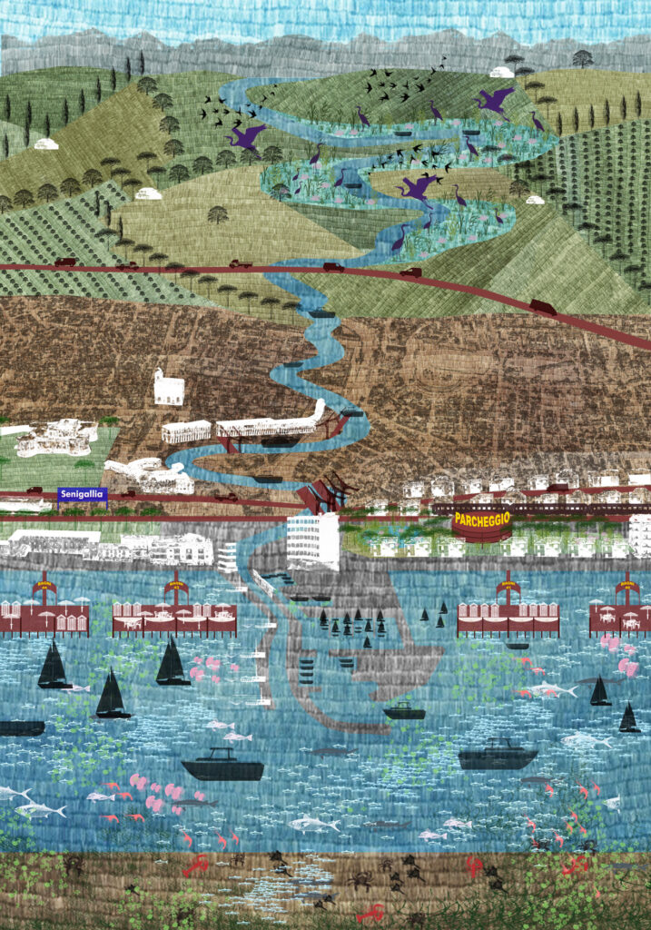 In Senigallia, la non più “spiaggia di velluto”, la cittadina marchigiana è rappresentata senza l’arenile dorato, da oltre un secolo simbolo della sua vocazione turistica ed economica. Come abitarla quando la spiaggia verrà mangiata dall’innalzamento progressivo e costante delle acque? Come modellare il corso del Misa per contenere le alluvioni sempre più frequenti? Come ripensare la cesura della ferrovia e della statale? In questa visione dal mare alla terra, Senigallia è mostrata in tutti i suoi strati: dai fondali marini alle dolci colline segnate da secoli di paziente lavoro mezzadrile, fino alle lontane ma presenti montagne appenniniche. Un infinito in miniatura, a ricordare l’importanza della sinergia tra gli elementi, naturali e antropici, perché tutto è interconnesso.
