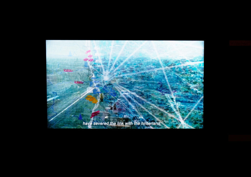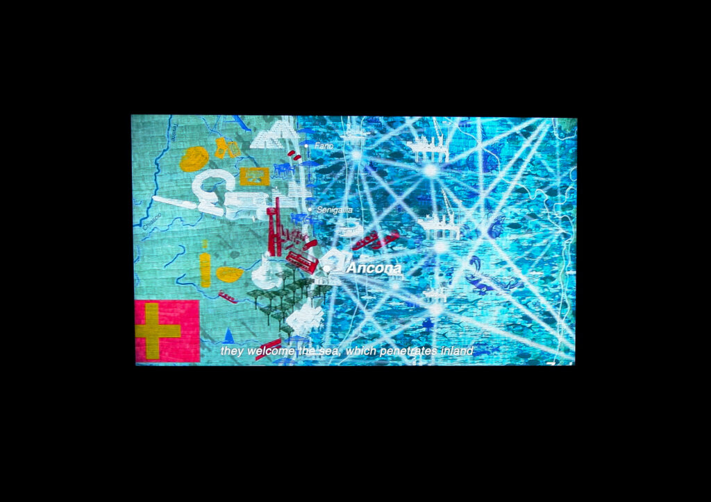 Questo gesto di cura e ricucitura parte dal mare, rappresentato come un parco naturale abitato dalla flora e fauna dei suoi fondali: si fa emergere l’invisibile, nella convinzione che tutelare significa prima di tutto conoscere, e quindi vedere. Le sue acque, torbide o limpide, ospitano la biodiversità marina più ricca del Mediterraneo, anche grazie alle ingressioni del Mar Rosso dopo l’apertura del Canale di Suez. Al centro del mare, un esercito di mostri marini, presi in prestito dalle mappe medievali, abita le acque internazionali come simbolo dell’inquietudine per l’ignoto, a ricordare il valore e la sacralità di questa “terra di nessuno”. Alla vegetazione opaca si sovrappone una rete infrastrutturata, il rizoma teorizzato da Deleuze e Guattari: una cartografia mobile e adattabile, che disegna le rotte commerciali tra Oriente e Occidente, convergendo in nodi attivabili ovunque.