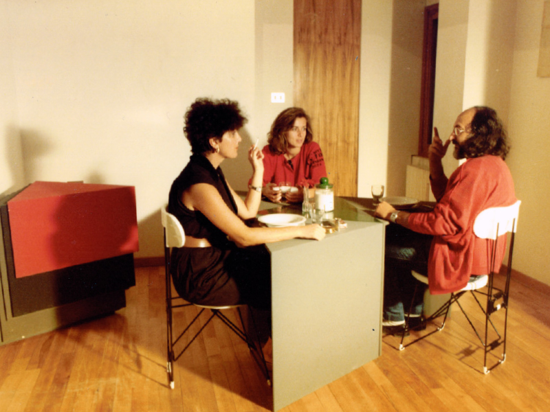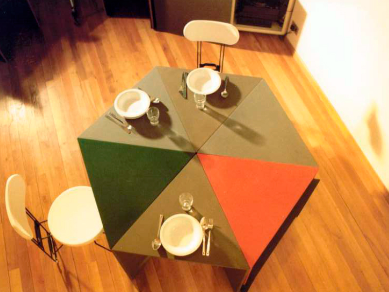 IP In quegli anni, il settore dell’arredamento stava sperimentando il concetto di posto-divano, non come oggetto autonomo, ma come composizione di moduli. Mi sono quindi chiesto: perché non studiare anche il posto-tavolo da poter comporre a piacimento? Ho cercato con serietà d’individuare la giusta porzione di spazio necessaria al comfort, la giusta misura per l’uomo. Inoltre, volevo rispondere a questa domanda attraverso un modulo non riconducibile alla sua funzione; una forma astratta e criptica, che una volta accatastata potesse diventare una scultura domestica. La mia era una battaglia contro la miseria dell’economia di spazi. Ho sempre odiato le sedie impilabili, che dichiarano apertamente la carenza di respiro di una casa. Anche per le sedie ho studiato un sistema che mi permettesse di avere un oggetto scultoreo astratto, irriconoscibile e non identificabile come una banale serie di “sedie impilate”.