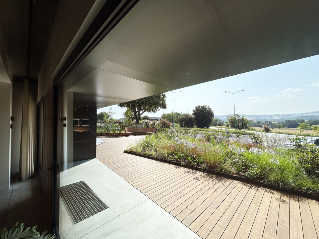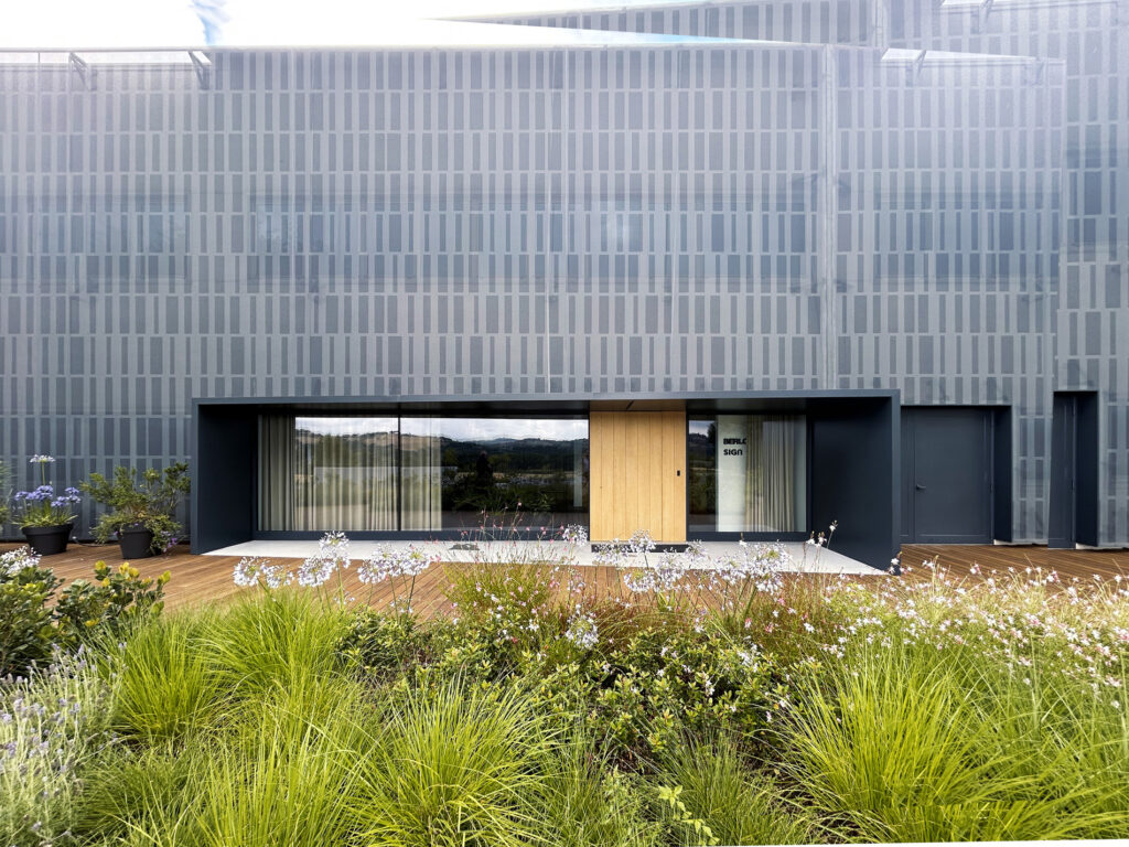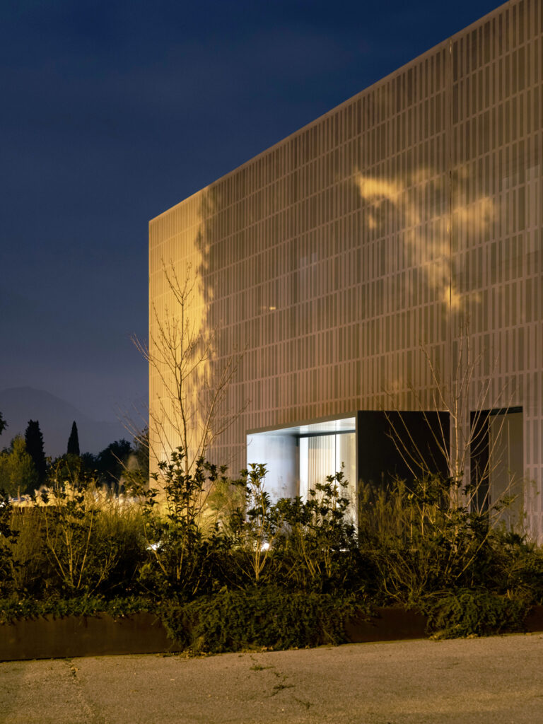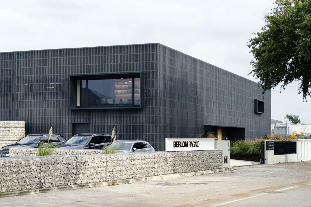 Nel contesto articolato di Fossombrone, tra archeologia, insediamenti produttivi e paesaggio spontaneo, il rinnovato showroom Berloni Bagno ridefinisce un nuovo limite tra architettura e paesaggio. La definizione del perimetro rappresenta il primo gesto progettuale, assumendo al contempo il ruolo di soglia e infrastruttura paesaggistica, capace di integrarsi con il contesto. L’accesso allo showroom si configura come un progressivo “svelarsi”, articolato attraverso percorsi non lineari che si snodano tra spazi verdi non addomesticati e luoghi di pausa e attesa. La facciata, rivestita con una texture vibrante e semitrasparente, dialoga con la luce e con le ombre generate dagli imbotti, intensificando la profondità visiva e la densità percettiva del prospetto. Gli interni, sebbene vincolati dalla struttura esistente, offrono una sequenza di volumi e quinte che si innestano nello spazio, generando percorsi eterogenei non gerarchici. In questo processo di “rivelazione” progressiva, l’estetica dell’intervento si fonda sulla valorizzazione delle qualità intrinseche dei materiali: la materia diviene medium del progetto, strumento espressivo e costruttivo al tempo stesso. La scelta di una materialità sincera assume una valenza etica: ogni superficie rimanda a valori di qualità, durevolezza e verità del costruire. L’intero progetto è caratterizzato da due operazioni complementari: giustapposizione e sottrazione. Questi strumenti compositivi rivelano situazioni spaziali aperte e permeabili, dove materia, luce e paesaggio si attivano reciprocamente, generando un nuovo racconto relazionale. Un luogo da attraversare, abitare, trasformare.